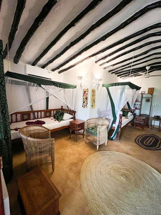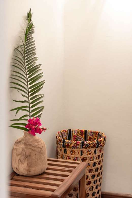 The Double Garden View Room offers a comfortable double bed and is situated on the ground floor just before the main building. It features a large veranda with views of lush gardens. Designed with organic elements, the room provides a calm and welcoming atmosphere, perfect for unwinding and connecting with nature.